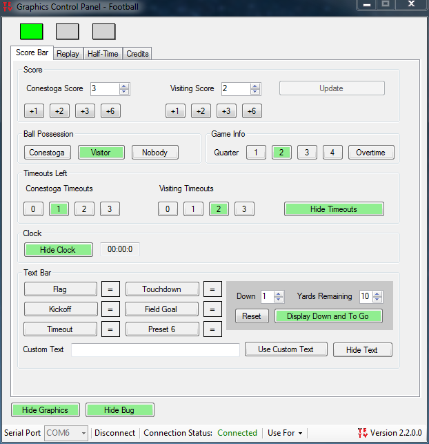 As a sophomore two years ago, I created a program to generate the live scoreboard graphics for my high school’s television sports broadcasts. At the time, I knew C# and Windows Forms most comfortably, so I used those technologies to build the software. There is a main control window, and then a second full-screen window which outputs to a second monitor showing the graphics over a black background. We take the output to the “second monitor” and apply luma key to remove the black background. Then we overlay the transparent graphics on our video feed.