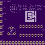 It starts with an Arduino Ethernet, which is basically an Arduino Uno with the ethernet shield built-in. It also comes with a POE (Power over Ethernet) module, which is something I didn’t realize existed before this project. For the display, I’m using a 4×20 character LCD, based on the popular HD44780 LCD controller. The controller’s popularity means that there are many resources and libraries for interfacing with it, especially from an Arduino. To conserve pins for future hardware additions, such as buttons or RFID readers, I opted to use a 74LS595 shift register to interface with the LCD. Because of the shift register, the wiring, and the required 10k trim potentiometer needed for the contrast adjustment, I decided to create a printed circuit board to bridge the LCD module with the LCD.